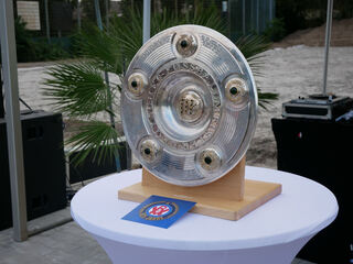 Auf einem Tisch stand das Replikat der Meisterschale von 1949 - ein an diesem Tag sehr beliebtes Fotomotiv.