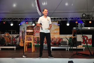 Claus Heim, Geschäftsführer Ketscher Backfischfest GmbH, bei seiner Eröffnungsrede direkt vor dem Fassanstich.