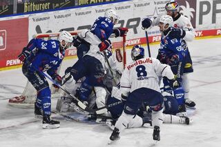 Kampf um den Puck vor dem Tor von Muenchens Evan Fitzpatrick (Nr.31) beim Spiel in der Penny DEL, Adler Mannheim - EHC Red Bull Muenchen.