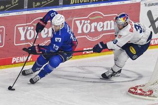 Mannheims Stefan Loibl (Nr.13) am Puck / spielt den Puck / play the puck gegen Muenchens William Riedell (Nr.33) beim Spiel in der Penny DEL, Adler Mannheim - EHC Red Bull Muenchen.