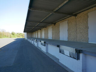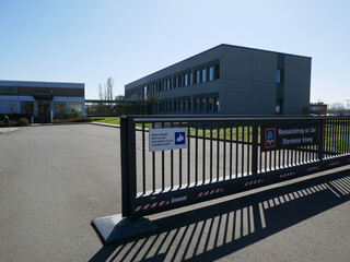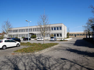 Die 40.000 Quadratmeter große Logistikhalle (hinten r.) und das Verwaltungsgebäude (vorne l.) werden bis Mitte 2022 geräumt. Ein Nachnutzer steht noch nicht fest, er könnte die beiden Einheiten aber separat nutzen.