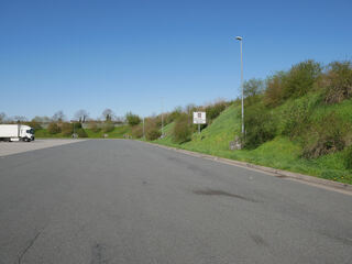 Ein Lärmschutzwall trennt das Betriebsgelände vom Wohngebiet an der Kalrsuher Straße (hinten) ab.