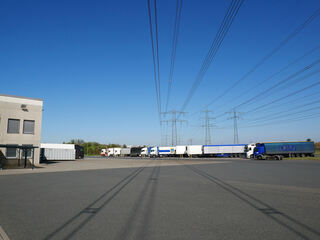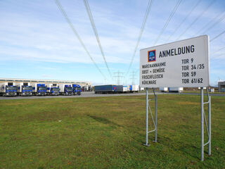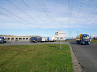 Die Einfahrt zum Logistikzentrum der Regionalgesellschaft von Aldi Süd im Heuweg. Die Hochspannungsleitungen durchteilen das Gewerbegebiet Süd sichtbar. Auch daran scheitert eine Erweiterung von Aldi Süd, hat das Unternehmen mitgeteilt.