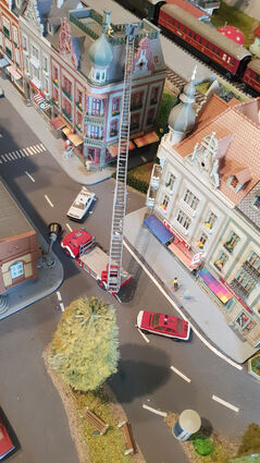 Die Straße ist gesperrt, es läuft ein Feuerwehreinsatz. Die Drehleiter ist ausgefahren, eine Laterne liegt am Boden.