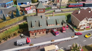 Im Bahnhof stehen zwei Züge und warten auf die Abfahrt, während der Feuerwehreinsatz in der Hauptstraße noch läuft.