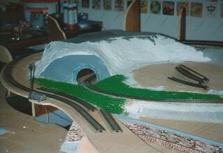 Die Modellbahn befindet sich im Bau. Fliegendraht wird für den Berg über Hölzer gespannt und mit Gips bearbeitet.