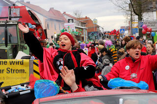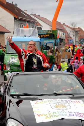 Zugmarschall Sandra Fluhrer gibt den Takt vor beim turbulenten Rosenmontagsumzug.