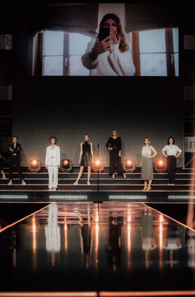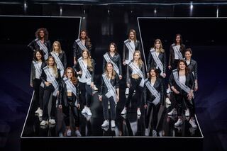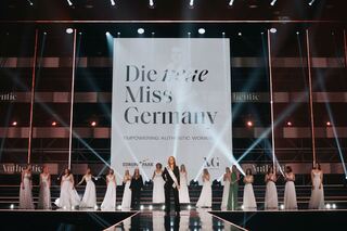 Die 16 Finalteilnehmerinnen der Wahl zur Miss Germany stehen auf der Bühne. 16 Kandidatinnen aus allen Bundesländern stellen sich der vorwiegend weiblichen Jury zur Wahl der Miss Germany 2021.