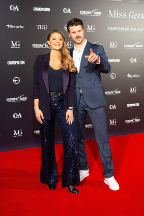 Thore Schölermann und seine Frau Jana Schölermann, Moderatoren der Wahl zur Miss Germany, stehen im Vorfeld der Veranstaltung auf dem Roten Teppich.