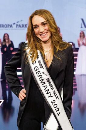 Anja Kallenbach, Miss Germany 2021 steht kurz nach ihrer Wahl auf der Bühne.