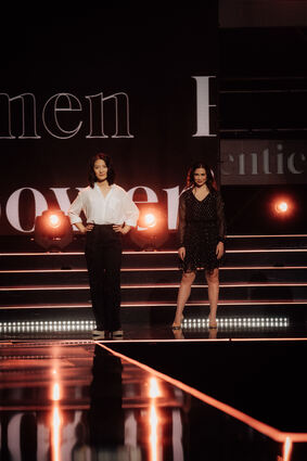 Die beiden letzten Finalistinnen der Wahl zur Miss Germany, Katharina Wohlrab und Anja Kallenbach (v.l.) stehen während der Veranstaltung auf der Bühne.