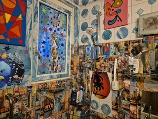 Auch das Badezimmer ist mit bunten Klebefolien und Bildern bestückt. Wer gut hinschaut, erkennt den Duschkopf.