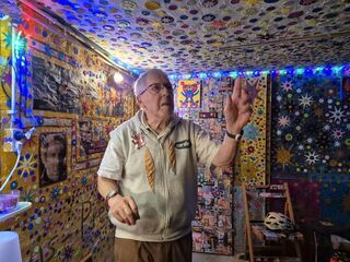 Auch der Kellerraum des 84-Jährigen ist mit bunten Glitzer-Klebern, Lichterketten und Figuren dekoriert.
