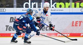 Matthias Plachta (Nr.22 Adler Mannheim) und Chris Jandric (Nr.7 ERC Ingolstadt) beim Spiel.