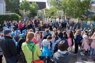 Einige Schüler haben auch blaue Mützen gestaltet. Hier sind Kinder der Hirschacker-Grundschule zu sehen.