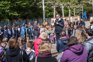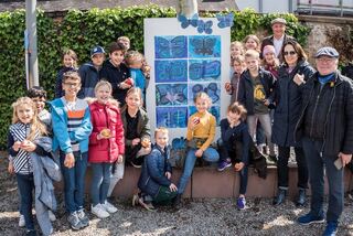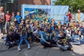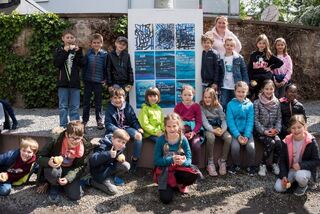 Die Kinder sind stolz auf ihre Kunstwerke. Oberbürgermeister Dr. René Pöltl und Kunstdidaktikprofessor Josef Walch loben die Kreativität der Schüler.