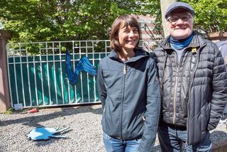 Josef Walch ist Kunstdidaktikprofessor und hat die Freilichtausstellung gemeinsam mit den Schülern erarbeitet. Hier posiert er mit einer Lehrerin des Hebel-Gymnasiums.