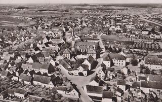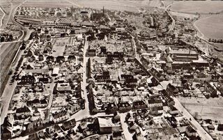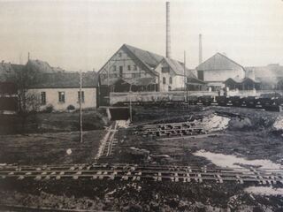 Der Zick-Zack-Ofen der Ziegelei Merkel (rechts unten) wurde 1927 gebaut und wurde als sehr modern gepriesen. Das Bild lässt die riesigen Ausmaße der Ziegelei erkennen, die von der Kirchen- bis zur heutigen Friedensstraße reichte.