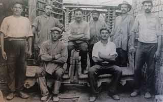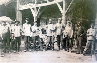 Die Mitarbeiter einer der Brühler Ziegeleien stellen sich Anfang des 20. Jahrhunderts dem Fotografen. Im Hintergrund sind die zum Trocknen aufgeschichteten Ziegel zu sehen.