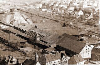 Auf dieser Luftaufnahme von 1957 erkennt man gut die Ausmaße der Ziegelei Merkel (rechts in der Mitte) und der Ziegelei Eder in der linken Bildhälfte.