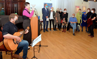 Musikalische Umrahmung der Vernissage von Mathias Buchta und Magdalena Lammes von der Klangfabrik, Bürgermeister Dr. Ralf Göck, Dorothea Paschen (Ehrenvorsitzende der Gedok), Sigrid Kiessling-Rossmann, Monika Maier-Speicher, Agnes Pschorn, Klaus Nikolaus (Besucher), Liliana Geiss, Inrid Eckert, Philine Maurus, und Petra Lindenmeyer.