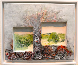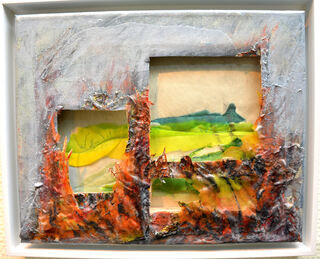Ingrid Eckert, Waldbrand I, Assemblage mit Seidenorganza-Applikationen.