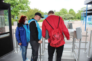 Noch haben Mitarbeiterin Rita Isler und Leiter Patrick Berndt Zeit, um bei Bedarf bei der Handhabung des neuen Einlasssystems zu helfen.