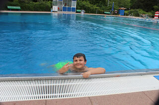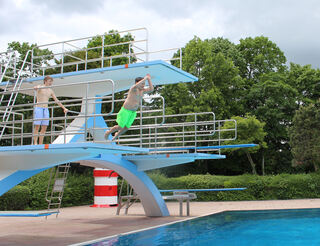 Jannis Schaut (r.) springt voller Leidenschaft in das rund 23 Grad warme Wasser. Bruder Clemens ist als nächster dran.