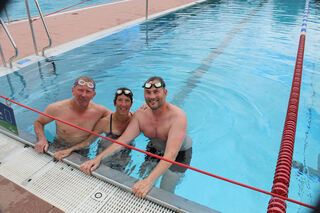 Bernd (v.l) und Kerstin Leibert sowie Uwe Pohlink genießen ihren ersten Tag im Freibad in diesem Jahr gemeinsam.