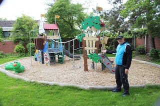 Bäderleiter Patrick Berndt zeigt den nagelneu gestalteten Spielplatz.