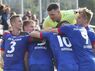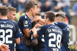Die Waldhof-Spieler bejubeln das 1:0 durch Kevin Koffi.