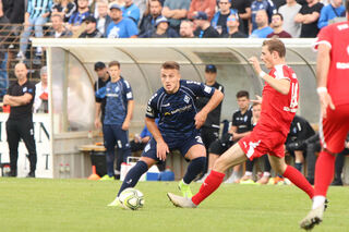 Mete Celik (li.) spielt den Ball an Yannick Schneider vorbei.