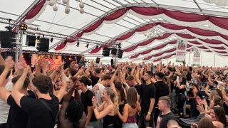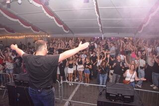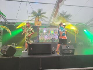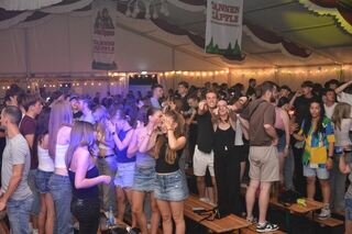 Tobias Kief von den "who2ladies" lässt zu "How much is the fish" von Scooter das Zelt am Donnerstagabend beben.