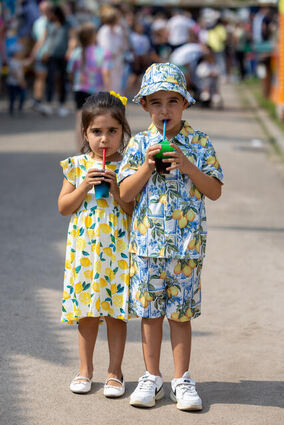 Tuana (vier Jahre) und ihr Bruder Rahimcan (fünf Jahre) aus Ketsch genießen ein Slush-Eis auf dem Ketscher Backfischfest.