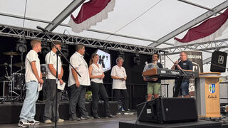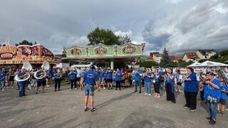 Die Ketscher "Hewwlguggler" spielen bei der Eröffnung des Backfischfestes "Sweet Caroline".