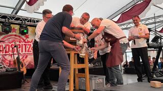 "Schwere Geburt" beim Fassbieranstich, doch gemeinsam wird der Gerstensaft zum Laufen gebracht.