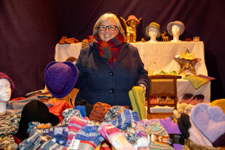 Standbetreiber "Wilhelm" bietet selbstgestrickte und gefilzte Waren an.