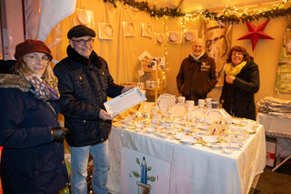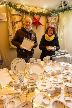 Dr. René Pöltl und seine Frau Stefanie freuen sich über eine neue handgefertige Porzellanplatte am Stand vom Atelier Blattwerk.
