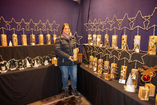 Hier der Stand der "Ideenschmiede". Hier gibt es Sterne und Tannenbäume aus Baustahl mit Holzfuß in groß und klein mit Beleuchtung.