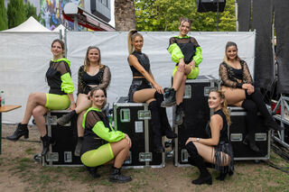 Die Tänzerinnen von den Pfitzemeier Cheerdancers tanzen auf der Bühne zu der Technomusik von Kerstin Eden.