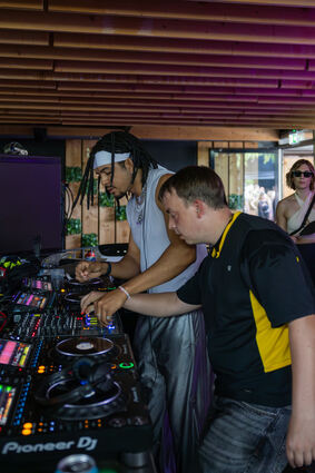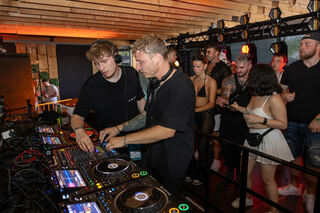 Die DJs J.Martius und TLNMR zusammen am Mischpult.