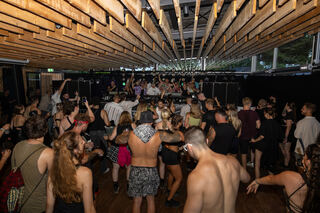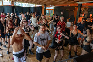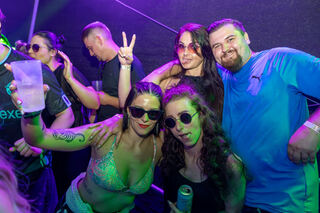 Auf dem Floor two wird für die Besucher Hardtechno / Trance aufgelegt. Die Temperaturen gleichen einer Sauna. Diese Gruppe hat trotzdem sichtlich Spaß.