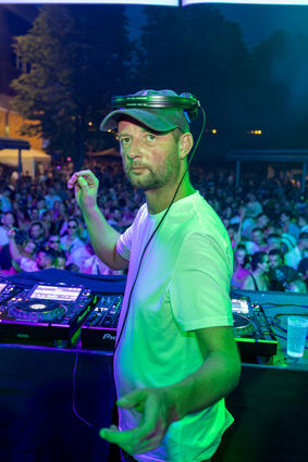 Ein Blick auf die Bühne während DJ Felix Kröcher den Gästen mit seinem Beat einheizt.