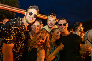 Gruppenfoto vor der Bühne, die Freundesgruppe hat Spaß bei der Musik von Felix Kröcher.