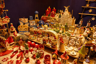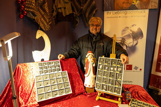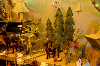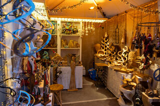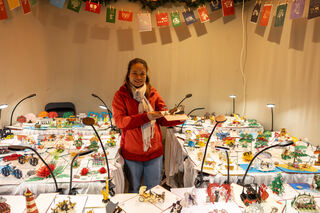 Blick in den Stand von Tina Miguel Rückert, sie verkauft weihnachtliche Dekoartikel aus verschiedensten Materialien.
