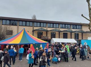 Viele Besucherinnen und Besucher beim Narrensprung vor der Rheinhalle in Ketsch.