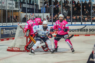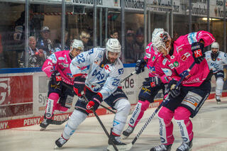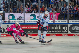 Hubert Labrie von den Iserlohn Roosters tritt gegen Daniel Fischbuch von den Adler Mannheim im intensiven Spiel der Penny DEL an.