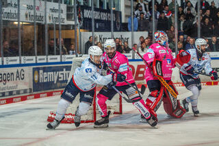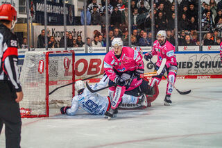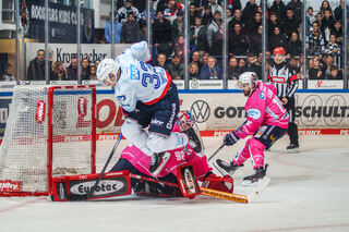 Colton Jobke von den Iserlohn Roosters fordert Yannick Proske von den Adler Mannheim in einem packenden Zweikampf.