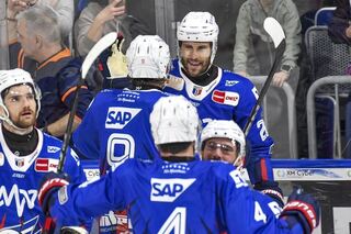 Jubel nach dem 3:2 von Mannheims Kris Bennett (Nr.21).