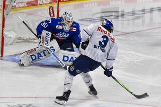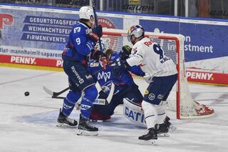 Muenchens Maximilian Kastner (Nr.93) gegen Mannheims Leon Gawanke (Nr.9) und Mannheims Arno Tiefensee (Nr.30)